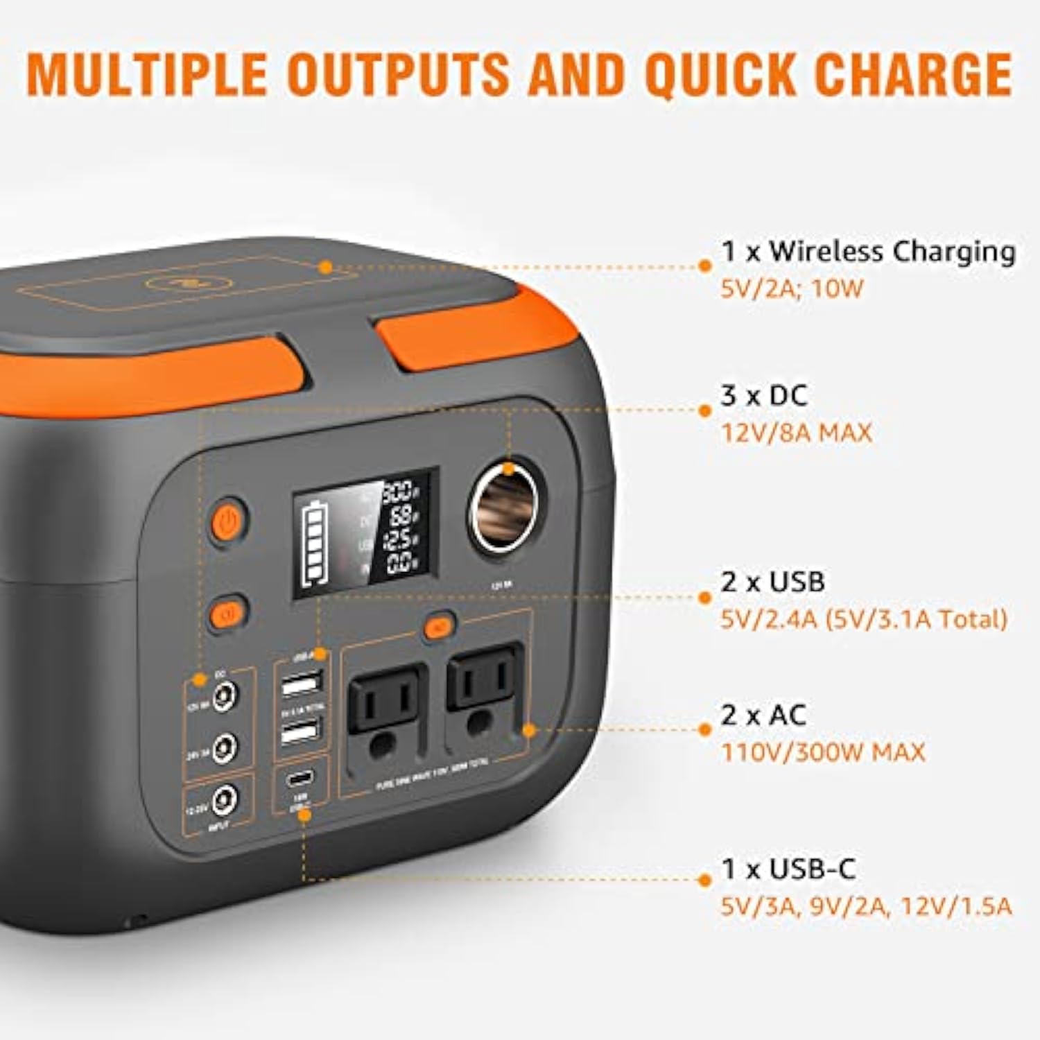 • 【Multiple Charging Outputs Provide More Options】 It is equipped with 2*AC outlet(110V 300W), 2* USB ports, 1*USB-C, 2*DC ports, 1*car port and 1*10W wireless charging port. Deliver stable and security power to most of your devices (less than 300W) like laptop, phone, camera, drone, light, CPAP machine etc. Ideal for outdoor activities(camping, RV trip, fishing, hunting, boating) and home emergency(power outage, hurricane)