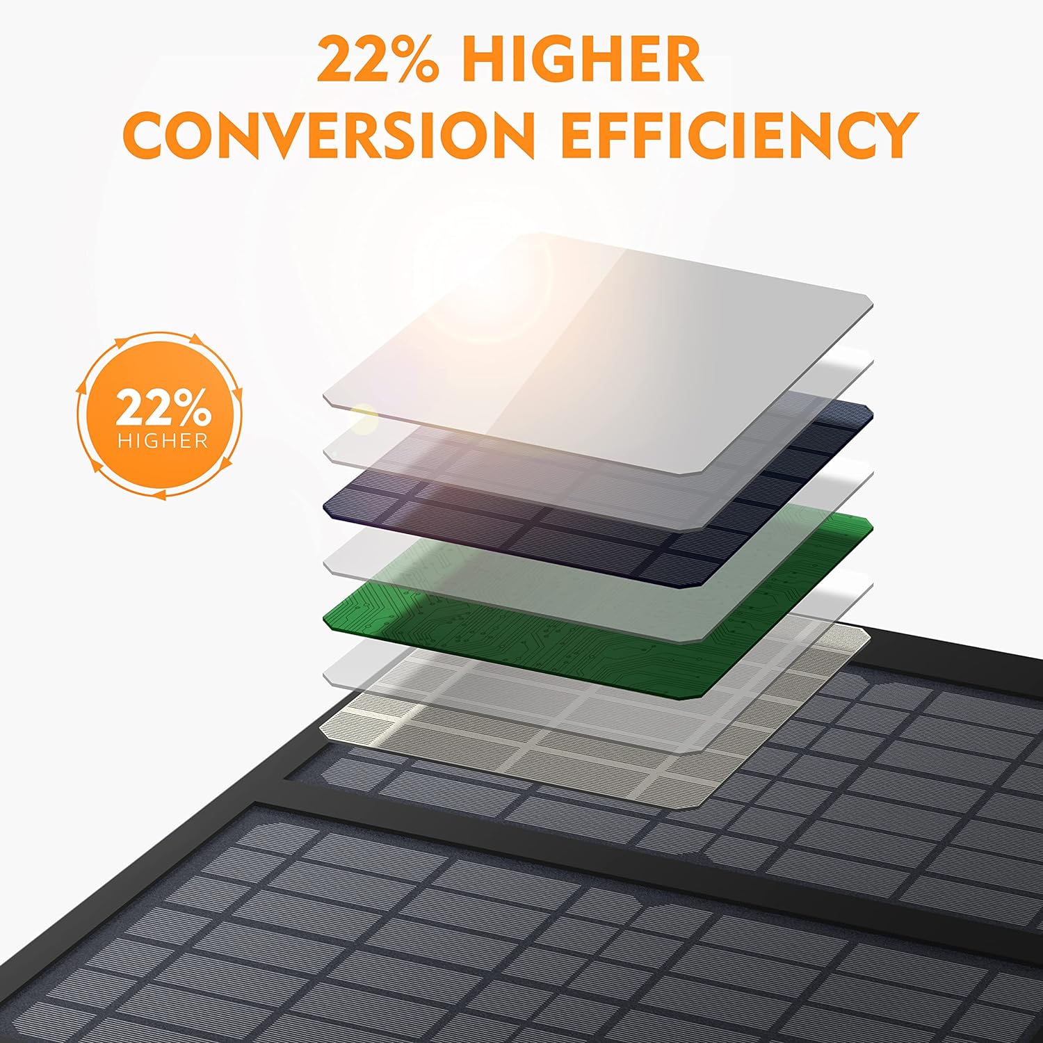 • HIGHER CONVERSION EFFICIENCY: EnginStar 40W monocrystalline silicon solar panel provide conversion efficiency of 24%, higher than other conventional panels. The built-in smart chip intelligently identifies your device and maximizes its charging speed while protecting your devices from overloading.