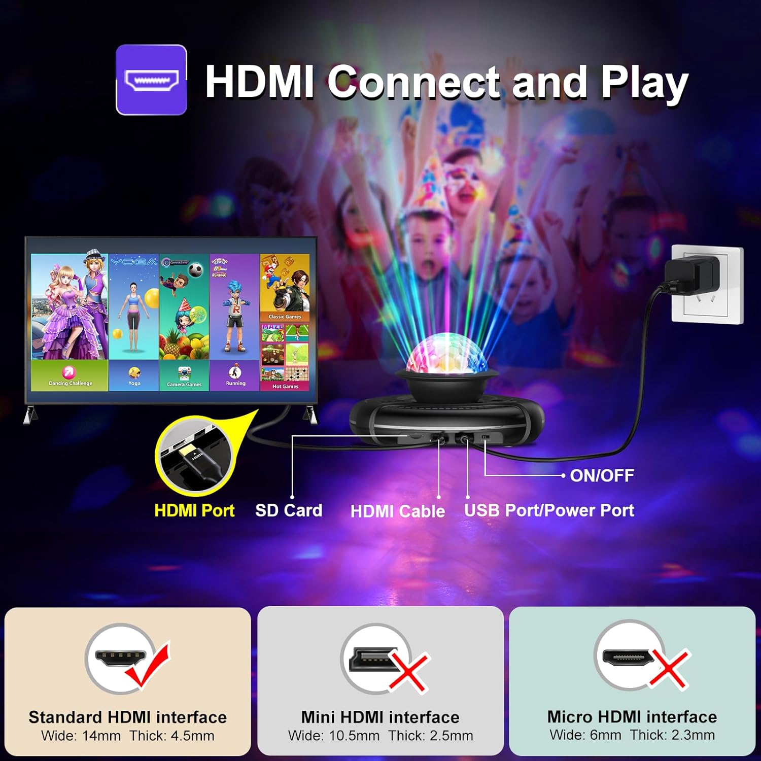 • 🎮【PLUG AND PLAY DANCING GAME】Connect the HDMI cable of the host to the HDMI interface of the TV, just turn on the switch on to play. The newest upgraded IC chip provides stable and high quality video output. Design of the combination of high-definition smart camera host and disco ball lamp, 3D camera real-time image capture, directly use body movements to control, let people interact with the game immersively. DISCO ball lamp can increase the atmosphere of family gatherings and parties.