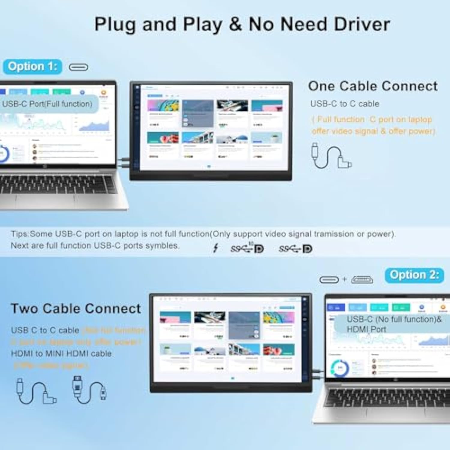 • ➤【Widely applicable & Plug and Play No Need Driver】-The Portable Monitor for Laptop Screen Extender design with 2 USB-C ports & 1 HDMI port compatible most Windows,Mac (suit M1/M2/M3 Pro/Max chip), Phone, Chrome, Switch,PS4/5, Xbox etc.Tips: Some laptop and phone not with full function C port (only support video signal) need extra 5V2A USB-A to C cable (offer power).