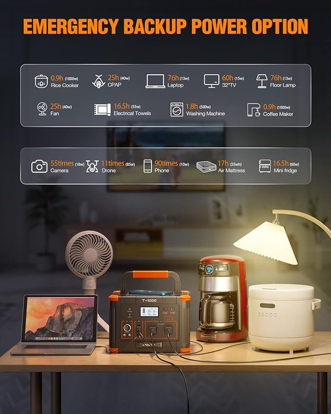 • 【Warm Tips】 Please do not use this power station to power devices with a rated power of more than 1000watts. Devices' Working time (estimation) = 999Wh* 0.85 / operating power of your device. (0.85=Conversion Rate) The actual working time may vary under different situations. Please turn off the AC output when not in use, otherwise it may run the battery out even without other loads.To turn on the wireless charger, please press the“POWER ON/OFF" button first, then press the "USB" button.