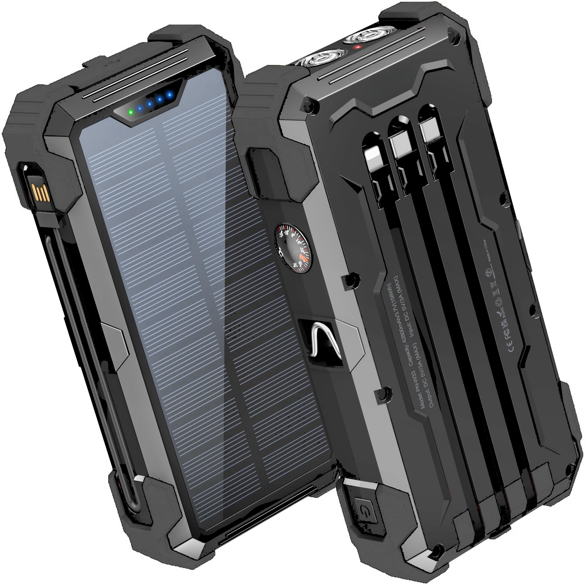 • [Exclusive Design]The solar power bank has two exclusive and useful tools, a multiple-purpose LED red light pointer and a physical thermometer. You can use the laser pointer to point out something, send a signal, play with pets, etc. The thermometer can detect indoor and outdoor temperatures at any time without power consumption.