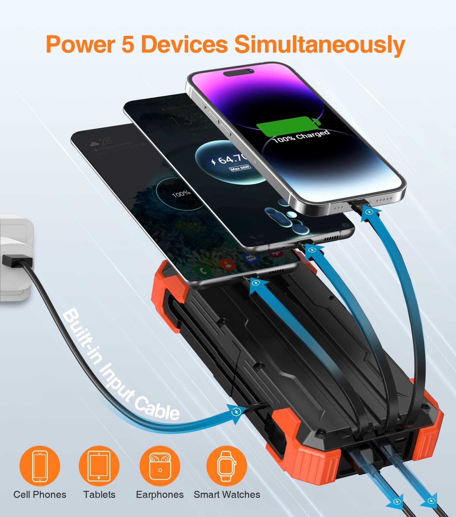 • [Five Outputs & Three Inputs ]The portable charger has built-in 3 output cables (iOS & USB-C*2), and a 24cm extended USB-A input cable. Providing your cable-free time. It also has various ports (USB-C Output/Input &USB Output & iOS Input). Powering 5 devices at the same time, compatible for all iOS and Android users.