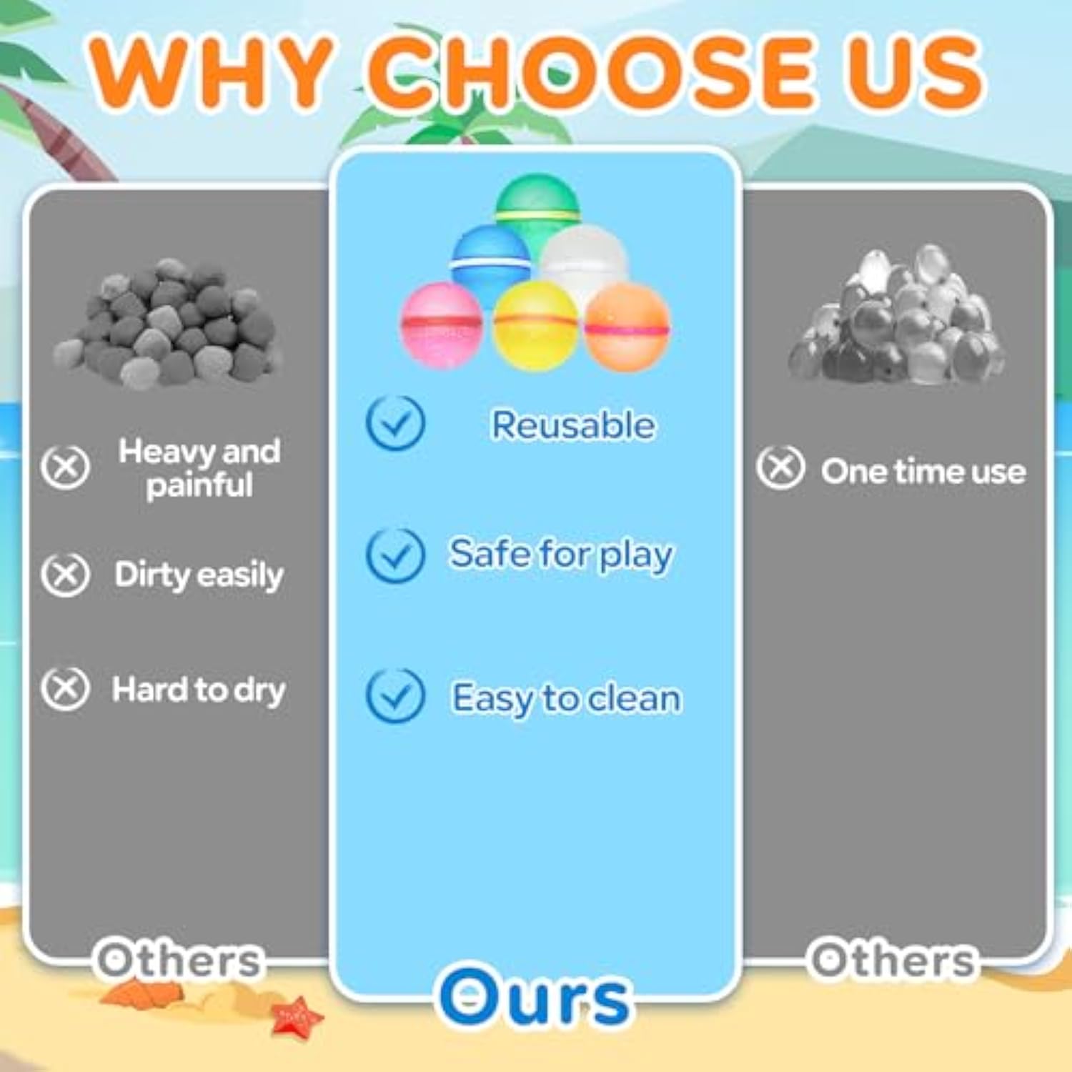 • 😄Fun Reusable Water Balls: Say goodbye to traditional water balloons! Our refillable water balloons can be reused 1000+ times, making them environmentally friendly and hassle-free. Simply dry the refillable water balls for storage, saving money and avoiding environmental pollution.
